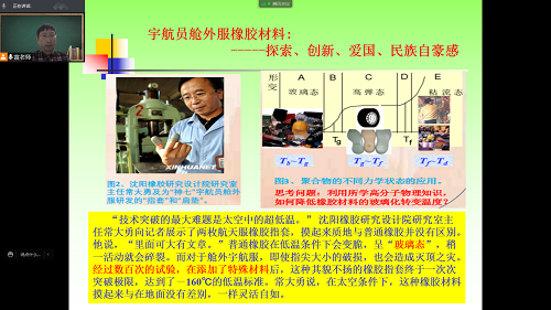 课上,富露祥老师以说课方式具体介绍了高分子材料科学的诞生与发展,包括课程的教学内容、学习方法、教学资源、考核要求等。以具体案例解释在教学设计、案例搜集、课件制作、线上讨论、授课过程等环节如何有机融入思政元素,将高分子科学的发展历史与科学探索精神相融合;将科学家的研究历程与工匠精神相联合;将生物降解高分子材料的使用与环境保护和绿色发展相结合,实现专业课程与思想政治理论课同向同行,在启发学生独立科研能力和创新能力的同时,培养学生科学品质和大国工匠精神,潜移默化地立德树人融汇到知识传授的全过程之中。