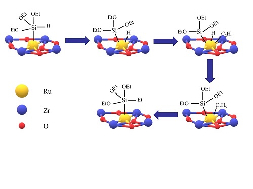 我校资源化工与材料教育部重点实验室与中科院过程工程研究所苏发兵研究员团队合作研究,报道了一种带正电荷的单原子Ru负载在工业ZrO2纳米晶体上的多相催化剂(0.5Ruδ+/ZrO2),将其用于乙烯与三乙氧基硅烷(TES)的硅氢加成反应,合成了乙烯基三乙氧基硅烷(ETES)。反应在60 ℃达到TES转化率99%、ETES产物选择性98%,展现的催化性能明显优于工业均相催化剂RuCl3·H2O。尤其是,该催化剂可以通过简单离心分离回收并重复使用,降低产物的纯化难度。结构表征和密度泛函理论计算揭示了,Ru单原子催化剂优异的催化活性得益于其原子级分散及异于均相催化剂的独特电子性质,反应路径遵循典型的Chalk-Harrod机理。这种高效的非均相Ru单原子催化剂有望取代现有的均相催化剂体系,开辟一条绿色的硅氢加成工业路径。