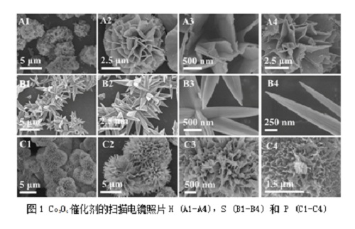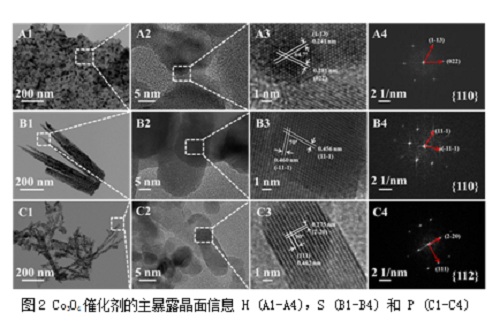 Co3O4是一种相对廉价的催化剂,但其完全去除甲苯或苯的温度往往超过300 ℃,不仅不够高效,而且浪费能源。针对Co3O4基催化剂催化活性及稳定性不足的难题,taptap全球版链接环境与安全工程学院张学军教授团队,定向合成了一系列形貌可控的Co3O4催化剂。通过优化制备方法,调控Co3O4催化剂的形貌、主暴露晶面、表面缺陷浓度、氧化还原性能等,达到高效且稳定去除苯系VOCs的目的。所得Co3O4催化剂的扫描电镜图片可以看出样品均是三维分层结构(图1),且表现出不同的主暴露晶面(图2)。