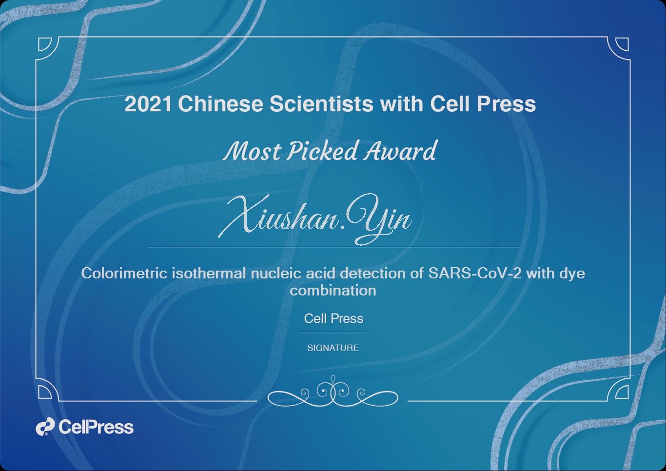 2022年11月22日,经国际知名全学科学术出版机构——细胞出版社(Cell Press)展示,我校应用生物学研究所尹秀山教授团队两项科研成果【Colorimetric isothermal nucleic acid detection of SARS-CoV-2 with dye combination】、【Simultaneous detection of SARS-CoV-2 and pandemic (H1N1) 2009 virus with real-time isothermal platform】荣获交叉学科领域“细胞出版社 2021年度最受欢迎中国论文”。