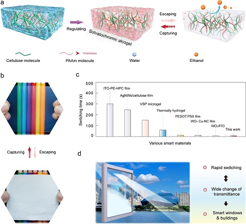 近日,我校能源与化工产业技术研究院(产研院)许光文教授团队,赵大伟老师指导的硕士研究生陈珊利用生物质纤维素在分子尺度进行结构调控与特性设计,开发了一种自防御型智能窗材料与器件。该工作以taptap全球版链接为第一完成单位在国际学术期刊《Advanced Functional Materials》(IF:19.924)上发表研究论文‘Robust Solvatochromic Gels for Self‐defensive Smart Windows’ (https://doi.org/10.1002/adfm.202214382)。研究人员,通过调控纤维素与聚丙烯酰胺分子间的卷曲强度,构建的一种基于乙醇逃逸与捕获双重响应性、微观结构稳定性、密集纳米凸起形貌的溶液致变色醇凝胶(Solvatochromic alcogel),赋予了智能窗器件强悍的机械抗冲击(自防御性)及快速、动态光调控性(图1)。