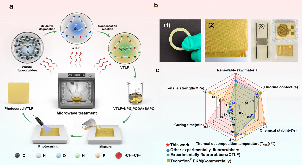 遥爪型液体氟橡胶可用作功能性含氟聚合物的前驱体、高端密封材料、高性能含氟涂层等,具有广泛的应用前景。目前,该类材料可通过氟烯烃的碘调聚反应和官能团引发自由基聚合反应等进行正向合成,但如何实现分子链序列结构可控,仍富有挑战。相较于正向合成,氧化降解(逆向)路线利用了含氟聚合物分子链中偏氟乙烯结构的化学反应特性,为反应型高含氟低聚物的分子链序列结构可控合成提供了独特的方案。材料学院李东翰教授通过构建“微波-力-温度”耦合外场高效氧化降解-端基官能团转化的“一锅法”连续反应体系,实现了废弃固体氟橡胶-液体端羧基氟橡胶(CTLF)-液体端乙烯基氟橡胶(VTLF)的连续合成,首次实现可自由基型光固化高性能先进反应型高含氟低聚物的高效合成,并攻克了含氟聚合物强极性与低粘度无法兼顾的共性难题。2025年5月28日,相关成果以“Upcycling of waste fluororubber to photocurable high-performance vinyl-terminated liquid fluororubber by multi-field coupling one-pot step-wise reactions”为题发表在Advanced Science上。第一作者为材料科学与工程学院李东翰教授,共同第一作者为材料科学与工程学院硕士研究生于璐,共同通讯作者为中国科学技术大学陈昶乐教授和taptap全球版链接理学院杨佳博士。
