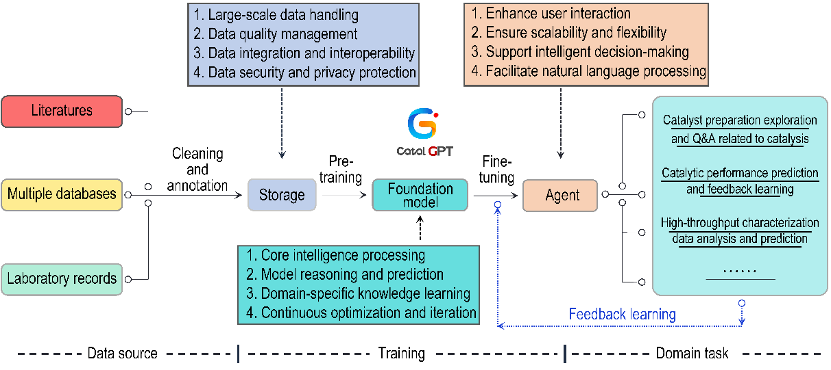 在人工智能与催化科学的交叉前沿,我校产研院许光文教授团队基于开源大语言模型qwen2,创新性构建了专为催化剂设计的智能平台:Catal-GPT,通过自然语言处理技术实现催化剂配方的高效生成与优化,为工业催化领域注入全新动能。区别于与传统经验性的催化剂开发方式,Catal-GPT搭建了人机协同的创新链条。该系统采用模块化架构,整合催化剂的合成、表征与应用数据,经清洗编码后输入定制化GPT模型。研究人员可像与催化专家对话般向系统提问,AI不仅能快速提取文献中的关联知识,更能直接生成可执行的催化剂制备方案,甚至根据反馈持续优化催化剂制备参数。这项研究展现了生成式AI在催化领域的革命性潜力,当科学家与AI深度协作,催化剂开发将从“大海捞针”变为“精准制导”。随着更多高质量数据的注入,Catal-GPT将为工业催化剂开发提供关键支撑。