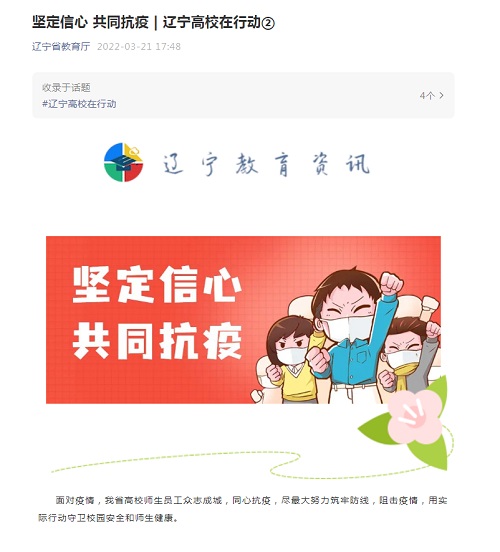3月21日,人民网、中新网客户端、辽宁省教育厅官方公众号以《坚定信心 共同抗疫 辽宁高校在行动》为题报道省内高校师生员工众志成城,同心抗疫情况,报道中转发我校《用“心理疏导+社工支持”守护校园 服务城市》特色做法。