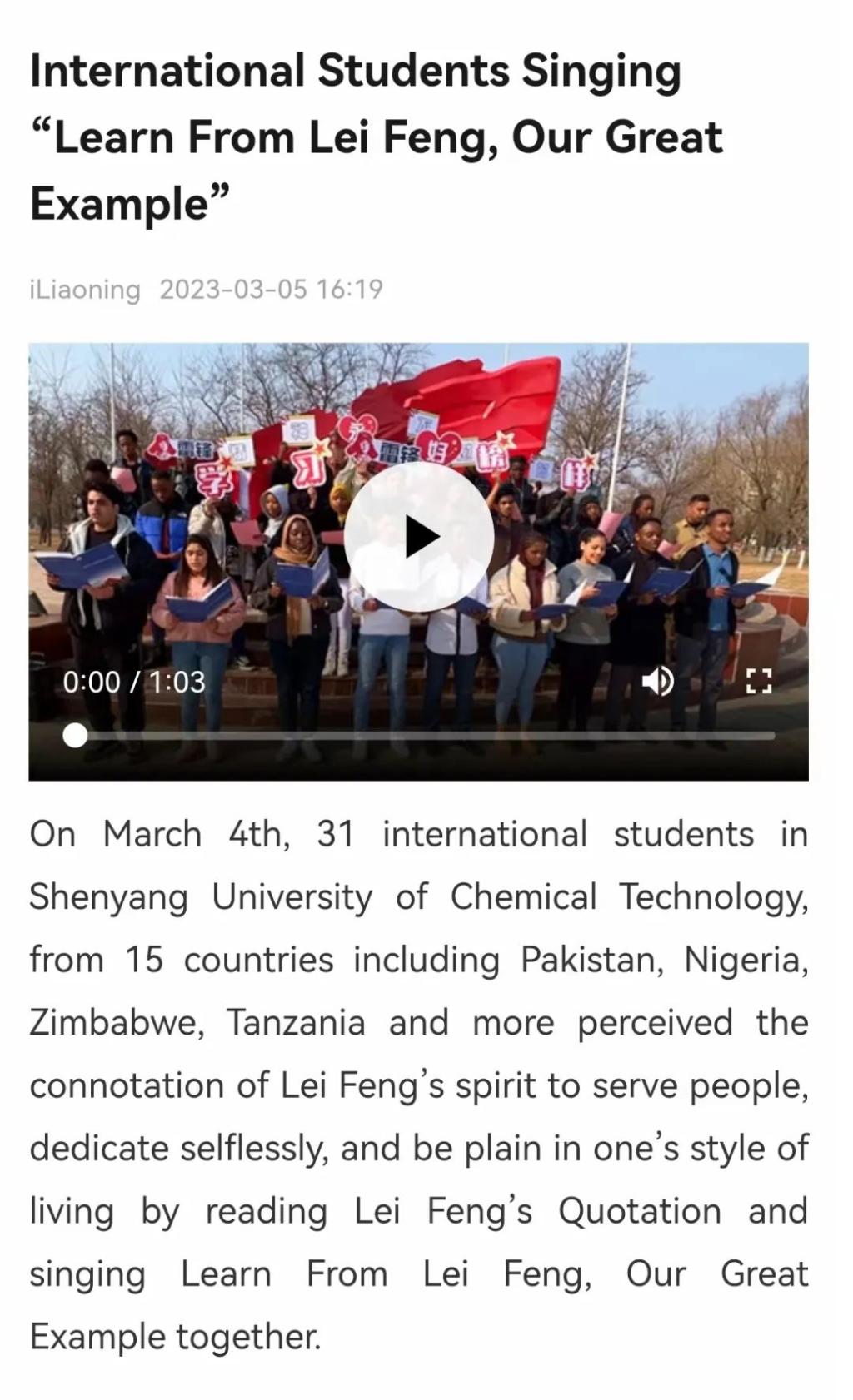 3月5日,辽宁日报“北国”客户端以《International Students Singing “Learn From Lei Feng, Our Great Example”》为题进行了报道。