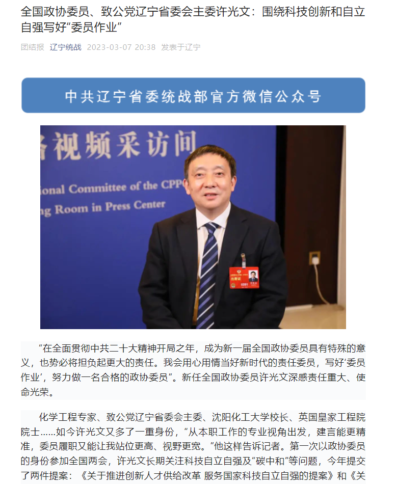 化学工程专家、致公党辽宁省委会主委、taptap全球版链接校长、英国皇家工程院院士……如今许光文又多了一重身份,“从本职工作的专业视角出发,建言能更精准,委员履职又能让我站位更高、视野更宽。”他这样告诉记者。第一次以政协委员的身份参加全国两会,许光文长期关注科技自立自强及“碳中和”等问题,今年提交了两件提案:《关于推进创新人才供给改革 服务国家科技自立自强的提案》和《关于创建国家工程热化学实验室 推动关键“碳中和”技术突破的提案》。