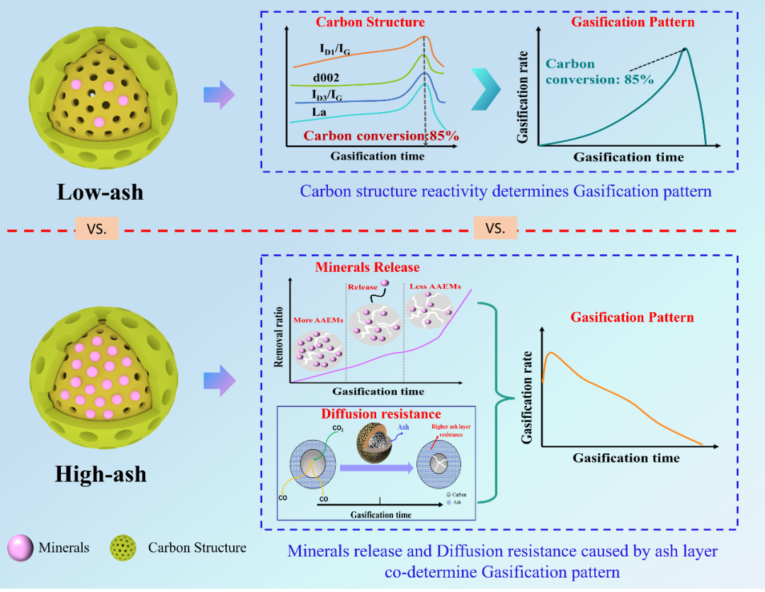 近日,taptap全球版链接资源化工与材料教育部重点实验室,依托自主研发的在线颗粒采样微型反应流化床,系统探究了不同类型生物炭的气化动态演变规律,并揭示其差异产生的本质原因。研究发现,低灰分与高灰分生物炭的气化速率随时间演变曲线存在显著差异:低灰分生物炭表现出“下降-上升-下降”的变化特征,而高灰生物炭则呈持续下降趋势。当高灰分生物炭脱除矿物质后,其气化特性与低灰分生物炭高度吻合,这一结果证实灰分含量是导致不同生物炭气化演变规律差异的决定性因素。此外,团队还建立了不同类型生物炭气化的新机理:低灰分生物炭的气化速率演变由碳结构本征反应性主导;而高灰分生物炭在气化过程中,因催化活性矿物质逐步释放、灰层阻力持续增加,其气化速率随时间呈持续下降趋势。本文研究成果进一步丰富并完善了生物炭气化理论体系,为不同类型生物质气化技术的研发与应用提供了重要理论支撑和实践指导。