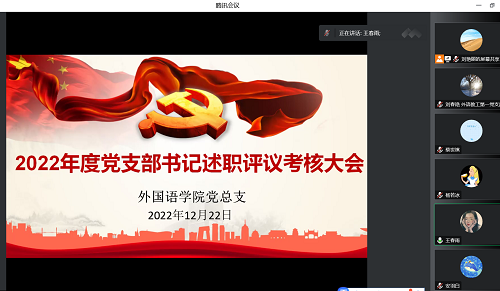 12月 22日上午10:00,外国语学院党总支在线上召开了2022年度党支部书记述职评议考核大会。总支委员、党员领导干部、群众代表、组织员及各支部书记参加了本次会议,会议由学院党总支书记王春雨主持。